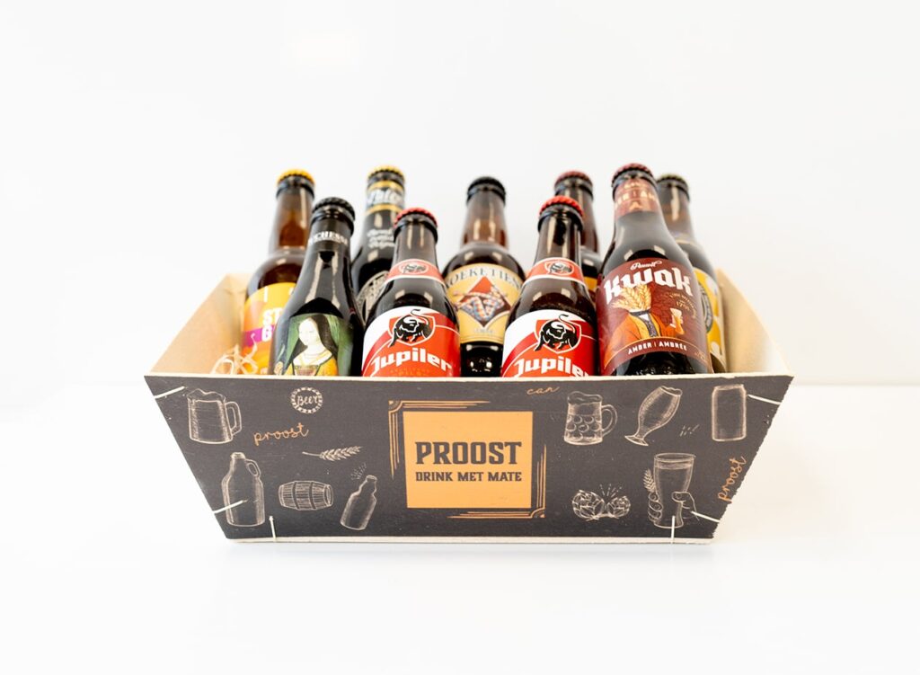 Een bierpakket is altijd een goed idee! Verras je collega, partner, vriend, nichtje, neefje of wie dan ook met een borrel. Dit biermandje is te vullen met een inhoud van maar liefst 5kg. Stevig genoeg voor een paar flesjes speciaalbier en wat lekkere hapjes! Vul het mandje met houtwol voor de bescherming en de luxe uitstraling. Verpak het geheel met transparante folie. Succes gegarandeerd! Dit mandje is ook beschikbaar in een kleinere variant, geschikt voor een inhoud van 3kg.Liever een biermandje op maat?