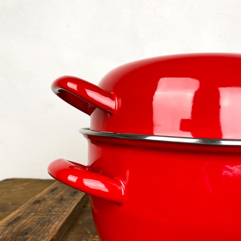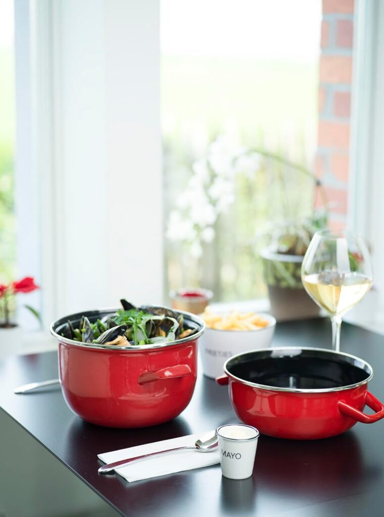 Breng de sfeer van de kust naar je eettafel met deze sfeervolle mosselpan van 1KG (18cm) in een opvallende rode kleur. Perfect voor het serveren van mosselen op traditionele wijze – warm, stijlvol en met karakter.