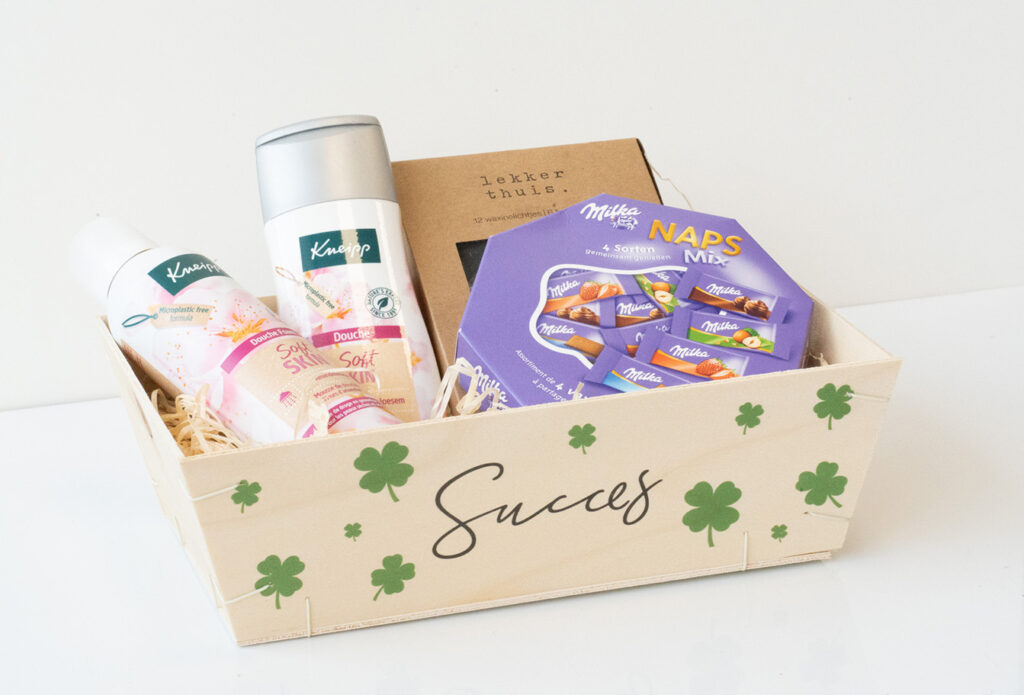Iemand succes wensen? Maak een leuk cadeautje in onze succes mandjes. Ze zijn leuk om te krijgen en misschien nog wel leuker om te geven. Vergeet het mandje niet op te vullen met houtwol en verpak het met ons mooie, transparante inpakfolie om jouw cadeau compleet te maken. Succes gegarandeerd!